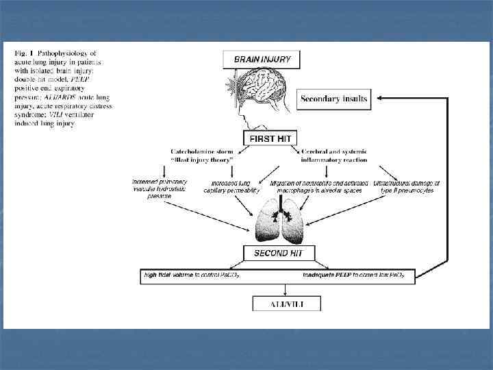 Вентилятор-индуцированное легочное повреждение неадекватная вентиляционная стратегия не только сама способна вызвать повреждение легких, но и усугубить ПОН через вентилятор-ассоциированное системное воспаление -ИВЛ большими ДО (10 -15 мл/кг) и низкий ПДКВ-высокий уровень цитокинов, повышение транспульмонального давления(перерастяжение альвеол) Bernard et all. , 1994: ОЛП-повреждение эндотелия и эпителия легких, в сочетании с нейтрофильным альвеолитом, который реализуется медиаторами и возрастающей капиллярно-альвеолярной проницаемостью, которая приводит к интерстициальному/альвеолярному отеку, альвеолярному коллапсу и стойкой артериальной гипоксемии