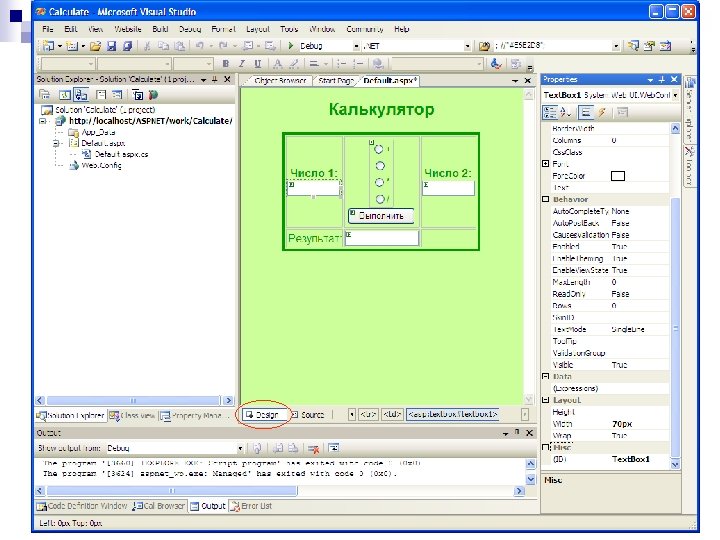 Особенности предыдущей ASP. NET-странницы Тег <input> с атрибутом runat превращает HTML-тег в серверный элемент (в данном случае – экземпляр класса Html. Input. Control). Этот элемент имеет свойство Value, в котором содержится вводимый текст. Атрибут runat в теге <form> организует возврат данных на сервер этой же форме (называется Post. Back). Прочитанные данные из <input> присваиваются свойству Value новосозданного экземпляра класса Html. Input. Control. Затем выполняется код в <script> (функция fun), вызванный событием On. Server. Click=”fun”. Функция переводит символы в верхний регистр и присваивает полученную строку свойству Inner. Text серверного элемента с идентификатором id=”The. Result”. В результате работы серверных элементов и их событий генерируются HTML-теги, встраиваемые в раздел пользовательского интерфейса. Полученная HTML-страница возвращается клиенту. При написании приложений в среде Visual Studio визуальная часть формы остаётся в файле. aspx, а код реализации класса формы, вместо тега <script>, по умолчанию, размещается в отдельном файле *. aspx. cs (для языка C#). Это «облегчает» страницу. aspx и позволяет работать над классами страницы нескольким разработчикам.