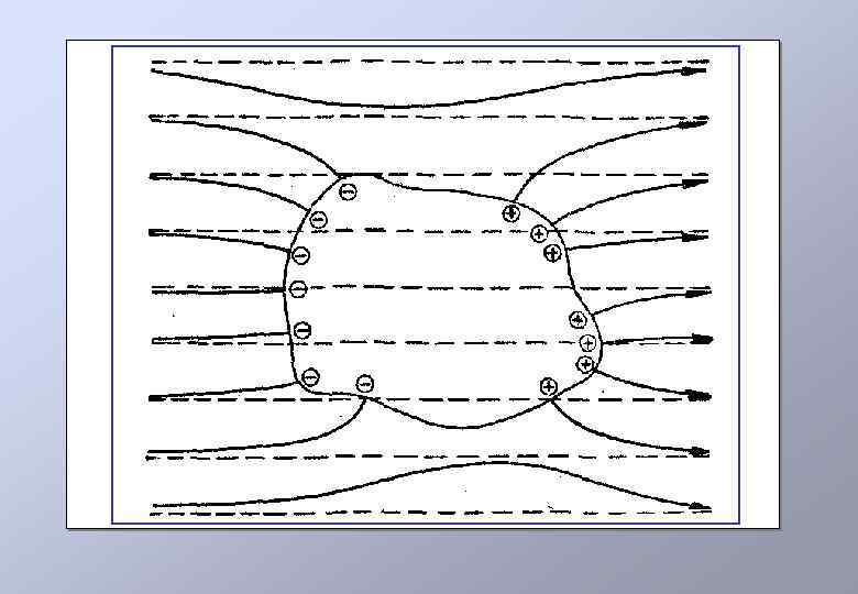 Проводник во внешнем электрическом поле При внесении незаряженного проводника в электрическое поле носители заряда в нем приходят в движение – положительные заряды движутся вдоль поля, отрицательные – против поля. В результате на поверхности проводника возникают индуцированные заряды, которые создают поле, направленное против внешнего поля. Перераспределение зарядов продолжится до тех пор, пока не выполнятся условия равновесия (1, 2) и поле внутри проводника не станет равным нулю. Поэтому нейтральный проводник разрывает электрическое поле – часть силовых линий заканчивается на индуцированных отрицательных зарядах и вновь начинается на индуцированных положительных зарядах в проводнике.