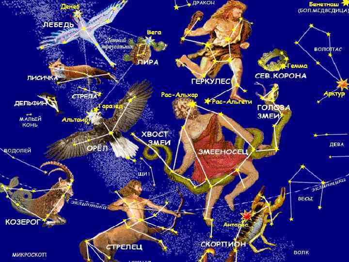 Созвездия — это набор ярких звёзд, соединённых в фигуры, названные именами персонажей древних мифов и легенд, животных или предметов.