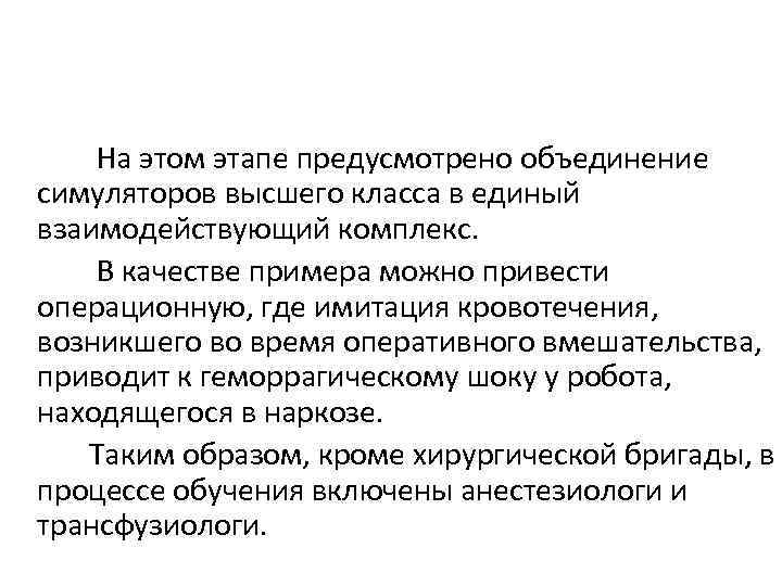 На этом этапе предусмотрено объединение симуляторов высшего класса в единый взаимодействующий комплекс. В качестве примера можно привести операционную, где имитация кровотечения, возникшего во время оперативного вмешательства, приводит к геморрагическому шоку у робота, находящегося в наркозе. Таким образом, кроме хирургической бригады, в процессе обучения включены анестезиологи и трансфузиологи.