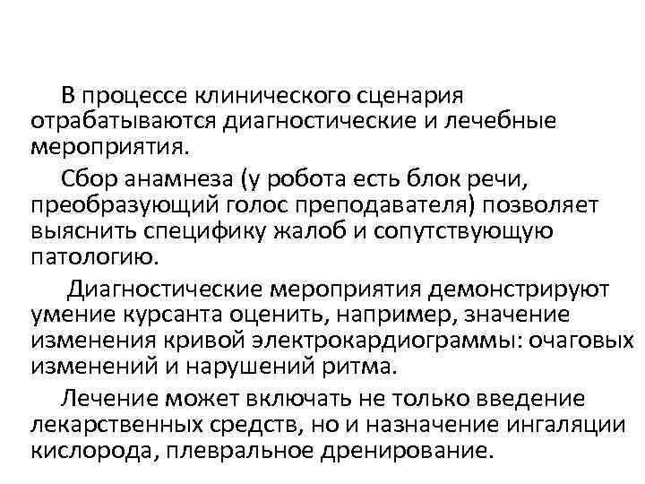 В процессе клинического сценария отрабатываются диагностические и лечебные мероприятия. Сбор анамнеза (у робота есть блок речи, преобразующий голос преподавателя) позволяет выяснить специфику жалоб и сопутствующую патологию. Диагностические мероприятия демонстрируют умение курсанта оценить, например, значение изменения кривой электрокардиограммы: очаговых изменений и нарушений ритма. Лечение может включать не только введение лекарственных средств, но и назначение ингаляции кислорода, плевральное дренирование.