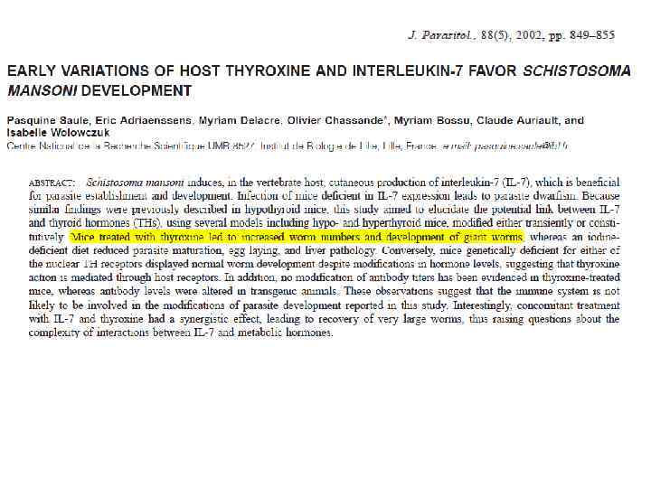 Wiener Klinische Wochenschrift Volume 115, Numbers 5 -6 (2003), 182 -185, Autoimmune thyroid diseases in patients with chronic fasciolosis Mustafa Demirci, S. Ercan Tune, Namik Delibas, M. Numan Tamer, Irfan Altuntas and Metin Korkmaz Methods Thyroid function of 32 patients with CF and 72 patients without fasciolosis infection was evaluated biochemically. Thyroid hormones, antithyroglobulin antibodies (Tg. Ab) and antithyroid peroxidase antibodies (TPOAb) were measured. Results In patients with CF, the prevalences of autoantibodies against thyroid peroxidase and thyroglobulin were 21. 9% (7/32) and 15. 6% (5/32) respectively. However, thyroid function disorder was identified in only 3 (9. 4%) cases. In the control group, TPOAb and Tg. Ab were determined in 2 (2. 7%) cases, but no one had thyroid function disorder. The prevalences of thyroid autoantibodies (χ2: 7. 948, p < 0. 01) and autoimmune thyroid diseases (χ2: 4. 007, p < 0. 05) were significantly higher in the CF group. Conclusions The high prevalence of TPOAb and Tg. Ab in CF suggests that patients with CF should be evaluated for autoimmune thyroid disorders at the time of diagnosis and during the follow -up period.