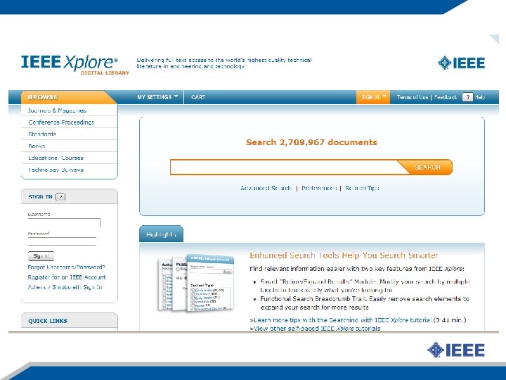 Издания IEEE периодические издания - почти 150 ведущих рецензируемых научных журналов в обл. электроники, иинженерии и компьютерной техники! Материалы конференций IEEE – материалы актуальнейших докладов, представленных на ежегодных конференциях IEEE во всем мире. Стандарты IEEE – качественные стандарты используются во всем мире и ппомогают промышленности и предприятиям разрабатывать новые технологии, открывать новые возможности для бизнеса, гарантируют качествои развивают рынки. IEEE e. Learning Library- лучшие образовательные программы IEEE в режиме онлайн. More in 2010 Now 1000+ annual titles! Smart Grid & more More courses in 2010 * IEEE-Wiley e. Books Library – новая книжная коллекция (более 400 наименований) охватывает многочисленные предметные области, включая Биоинженерию, Энергетика и Электричество, Коммуникационные технологии и другие перспективны иисследовательские направления. New in 2010