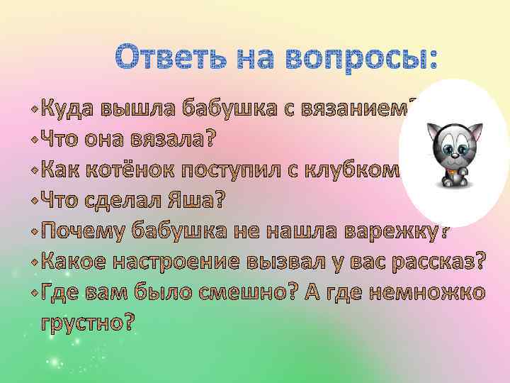 Прочитайте текст: Вышла бабушка в сад, села на скамейку и стала вязать внуку Яше варежку. Вязала, вязала, да и уснула. Котёнок увидел клубок в траве, прыгнул к нему, стал толкать лапкой. Клубок закатился в кусты. Там лежал Яша. Он поднял клубок и начал мотать на него нитку. Мотал, мотал, а нитке конца нет. Бабушка проснулась, ищет варежку. А от неё один пальчик остался. Всю варежку Яша на клубок перемотал.