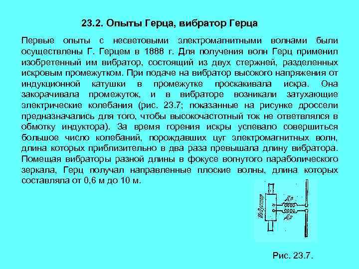 23. 2. Опыты Герца, вибратор Герца Первые опыты с несветовыми электромагнитными волнами были осуществлены Г. Герцем в 1888 г. Для получения волн Герц применил изобретенный им вибратор, состоящий из двух стержней, разделенных искровым промежутком. При подаче на вибратор высокого напряжения от индукционной катушки в промежутке проскакивала искра. Она закорачивала промежуток, и в вибраторе возникали затухающие электрические колебания (рис. 23. 7; показанные на рисунке дроссели предназначались для того, чтобы высокочастотный ток не ответвлялся в обмотку индуктора). За время горения искры успевало совершиться большое число колебаний, порождавших цуг электромагнитных волн, длина которых приблизительно в два раза превышала длину вибратора. Помещая вибраторы разной длины в фокусе вогнутого параболического зеркала, Герц получал направленные плоские волны, длина которых составляла от 0, 6 м до 10 м. Рис. 23. 7.