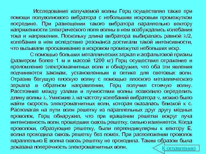 Исследование излучаемой волны Герц осуществлял также при помощи полуволнового вибратора с небольшим искровым промежутком посредине. При размещении такого вибратора параллельно вектору напряженности электрического поля волны в нем возбуждались колебания тока и напряжения. Поскольку длина вибратора выбиралась равной /2, колебания в нем вследствие резонанса достигали такой интенсивности, что вызывали проскакивание в искровом промежутке небольших искр. С помощью больших металлических зеркал и асфальтовой призмы (размером более 1 м и массой 1200 кг) Герц осуществил отражение и преломление электромагнитных волн и обнаружил, что оба эти явления подчиняются законам, установленным в оптике для световых волн. Отразив бегущую плоскую волну с помощью плоского металлического зеркала в обратном направлении, Герц получил стоячую волну. Расстояние между узлами и пучностями волны позволило определить длину волны . Умножив на частоту колебаний вибратора , можно было найти скорость электромагнитных волн, которая оказалась близкой к с. Располагая на пути волн решетку из параллельных другу медных проволок, Герц обнаружил, что при вращении решетки вокруг луча интенсивность волн, прошедших сквозь решетку, сильно изменяется. Когда проволоки, образующие решетку, были перпендикулярны к вектору Е, волна проходила сквозь решетку без помех. При расположении проволок параллельно Е волна сквозь решетку не проходила. Таким образом была доказана поперечность электромагнитных волн. К оглавлению