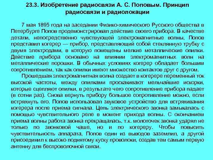 23. 3. Изобретение радиосвязи А. С. Поповым. Принцип радиосвязи и радиолокации 7 мая 1895 года на заседании Физико-химического Русского общества в Петербурге Попов продемонстрировал действие своего прибора. В качестве детали, непосредственно чувствующей электромагнитные волны, Попов представил когерер — прибор, представляющий собой стеклянную трубку с двумя электродами, в которую помещены мелкие металлические опилки. Действие прибора основано на влиянии электромагнитных волн на металлические порошки. В обычных условиях когерер обладает большим сопротивлением, так как опилки имеют множество контактов друг с другом. Прошедшая электромагнитная волна создает в когерере переменный ток высокой частоты, между опилками проскакивают мельчайшие искорки, которые сцепляют опилки, в результате чего сопротивление прибора падает (в сотни раз). Снова вернуть прибору большое сопротивление можно, если встряхнуть его. Попов использовал звуковое устройство для встряхивания когерера после приема сигнала. Цепь электрического звонка замыкалась с помощью чувствительного реле в момент прихода волны. С окончанием приема волны работа звонка прекращалась, т. к. молоточек звонка ударял не только по звонковой чаше, но и по когереру. Чтобы повысить чувствительность аппарата, Попов один из выводов заземлил, а другой присоединил к высоко поднятому куску проволоки, создав тем самым первую антенну для беспроволочной связи.