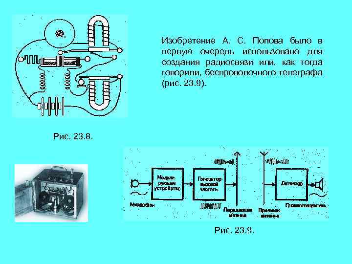 Изобретение А. С. Попова было в первую очередь использовано для создания радиосвязи или, как тогда говорили, беспроволочного телеграфа (рис. 23. 9). Рис. 23. 8. Рис. 23. 9.