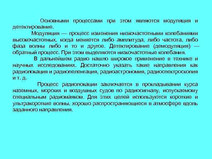 Основными процессами при этом являются модуляция и детектирование. Модуляция — процесс изменения низкочастотными колебаниями высокочастотных, когда меняется либо амплитуда, либо частота, либо фаза волны либо и то и другое. Детектирование (демодуляция) — обратный процесс. При этом выделяются низкочастотные колебания. В дальнейшем радио нашло широкое применение в технике и научных исследованиях. Достаточно указать такие направления как радиолокация и радиопеленгация, радиоастрономия, радиоспектроскопия и т. д. Процесс радиолокации заключается в прокладывании курса наземных, морских и воздушных судов по радиосигналу, испускаемому специальным радиомаяком. Для этих целей используются короткие и ультракороткие волны, хорошо распространяющиеся в атмосфере вдоль заданного направления.