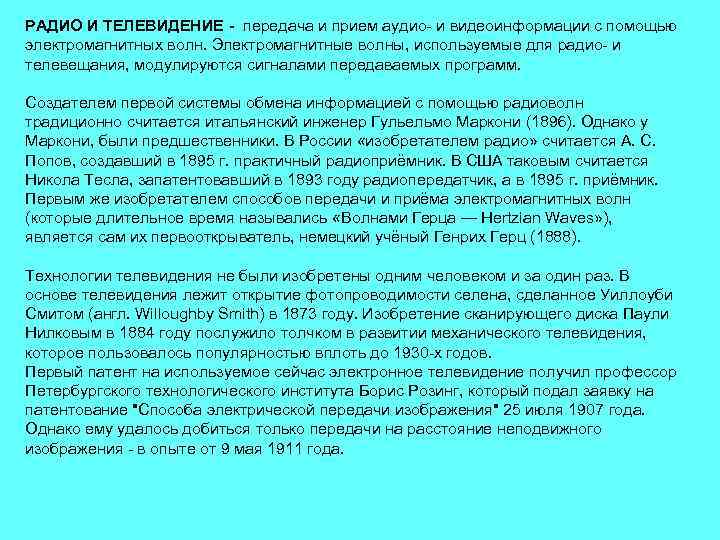 РАДИО И ТЕЛЕВИДЕНИЕ - передача и прием аудио- и видеоинформации с помощью электромагнитных волн. Электромагнитные волны, используемые для радио- и телевещания, модулируются сигналами передаваемых программ. Создателем первой системы обмена информацией с помощью радиоволн традиционно считается итальянский инженер Гульельмо Маркони (1896). Однако у Маркони, были предшественники. В России «изобретателем радио» считается А. С. Попов, создавший в 1895 г. практичный радиоприёмник. В США таковым считается Никола Тесла, запатентовавший в 1893 году радиопередатчик, а в 1895 г. приёмник. Первым же изобретателем способов передачи и приёма электромагнитных волн (которые длительное время назывались «Волнами Герца — Hertzian Waves» ), является сам их первооткрыватель, немецкий учёный Генрих Герц (1888). Технологии телевидения не были изобретены одним человеком и за один раз. В основе телевидения лежит открытие фотопроводимости селена, сделанное Уиллоуби Смитом (англ. Willoughby Smith) в 1873 году. Изобретение сканирующего диска Паули Нилковым в 1884 году послужило толчком в развитии механического телевидения, которое пользовалось популярностью вплоть до 1930 -х годов. Первый патент на используемое сейчас электронное телевидение получил профессор Петербургского технологического института Борис Розинг, который подал заявку на патентование "Способа электрической передачи изображения" 25 июля 1907 года. Однако ему удалось добиться только передачи на расстояние неподвижного изображения - в опыте от 9 мая 1911 года.