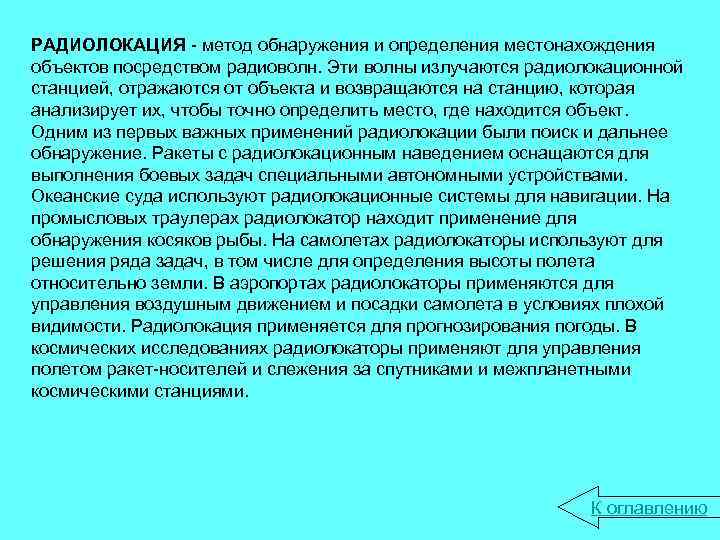 РАДИОЛОКАЦИЯ - метод обнаружения и определения местонахождения объектов посредством радиоволн. Эти волны излучаются радиолокационной станцией, отражаются от объекта и возвращаются на станцию, которая анализирует их, чтобы точно определить место, где находится объект. Одним из первых важных применений радиолокации были поиск и дальнее обнаружение. Ракеты с радиолокационным наведением оснащаются для выполнения боевых задач специальными автономными устройствами. Океанские суда используют радиолокационные системы для навигации. На промысловых траулерах радиолокатор находит применение для обнаружения косяков рыбы. На самолетах радиолокаторы используют для решения ряда задач, в том числе для определения высоты полета относительно земли. В аэропортах радиолокаторы применяются для управления воздушным движением и посадки самолета в условиях плохой видимости. Радиолокация применяется для прогнозирования погоды. В космических исследованиях радиолокаторы применяют для управления полетом ракет-носителей и слежения за спутниками и межпланетными космическими станциями. К оглавлению