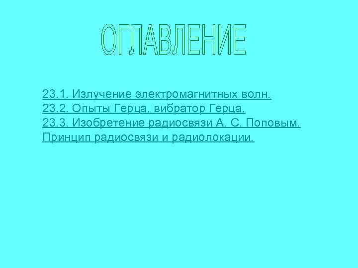 23. 1. Излучение электромагнитных волн. 23. 2. Опыты Герца, вибратор Герца. 23. 3. Изобретение радиосвязи А. С. Поповым. Принцип радиосвязи и радиолокации.