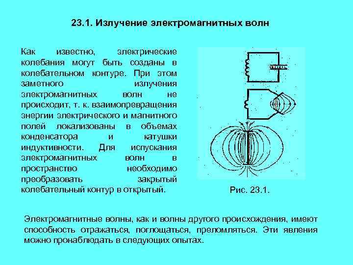 23. 1. Излучение электромагнитных волн Как известно, электрические колебания могут быть созданы в колебательном контуре. При этом заметного излучения электромагнитных волн не происходит, т. к. взаимопревращения энергии электрического и магнитного полей локализованы в объемах конденсатора и катушки индуктивности. Для испускания электромагнитных волн в пространство необходимо преобразовать закрытый колебательный контур в открытый. Рис. 23. 1. Электромагнитные волны, как и волны другого происхождения, имеют способность отражаться, поглощаться, преломляться. Эти явления можно пронаблюдать в следующих опытах.