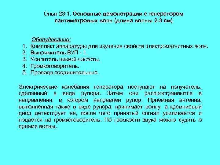 Опыт 23. 1. Основные демонстрации с генератором сантиметровых волн (длина волны 2 -3 см) 1. 2. 3. 4. 5. Оборудование: Комплект аппаратуры для изучения свойств электромагнитных волн. Выпрямитель ВУП - 1. Усилитель низкой частоты. Громкоговоритель. Провода соединительные. Электрические колебания генератора поступают на излучатель, сделанный в виде рупора. Затем они распространяются в направлении, в котором направлен рупор. Приемная антенна, выполненная также в виде рупора, принимает волну, а кремниевый диод детектирует ее, после чего принятый сигнал усиливается и подается на громкоговоритель. По громкости звука можно судить о приеме волны.