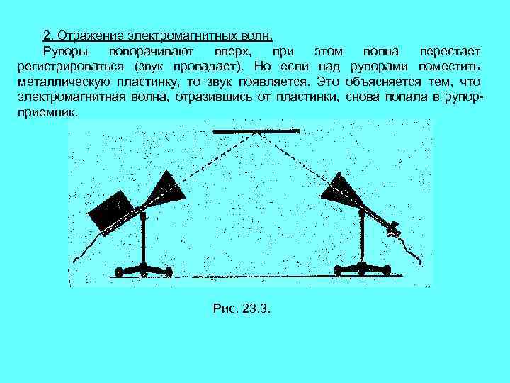 2. Отражение электромагнитных волн. Рупоры поворачивают вверх, при этом волна перестает регистрироваться (звук пропадает). Но если над рупорами поместить металлическую пластинку, то звук появляется. Это объясняется тем, что электромагнитная волна, отразившись от пластинки, снова попала в рупорприемник. Рис. 23. 3.