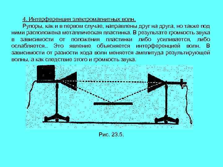 4. Интерференция электромагнитных волн. Рупоры, как и в первом случае, направлены друг на друга, но также под ними расположена металлическая пластинка. В результате громкость звука в зависимости от положения пластинки либо усиливается, либо ослабляется. . Это явление объясняется интерференцией волн. В зависимости от разности хода волн меняется амплитуда результирующей волны, а как следствие этого и громкость звука. Рис. 23. 5.