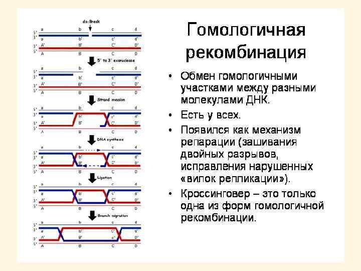 Репарация ДНК Способы исправления нарушений в структуре ДНК разные, иногда – с помощью рекомбинации с гомологичной хромосомой. Чаще всего при репарации вырезается фрагмент ДНК (длиной от 2 до 500 нуклеотидов, обычно около 30), затем нужный участок встраивается ДНК-полимеразой и вшивается лигазой. При пигментной ксеродерме происходит мутация в одном из семи генов, которые обеспечивают вырезание циклобутановых димеров, в результате свет вызывает образование пигментных пятен, может развиться рак кожи Некоторые двуцепочечные разрывы удается репарировать, но при этом часть ДНК теряется