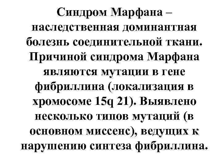 Синдром Марфана – наследственная доминантная болезнь соединительной ткани. Причиной синдрома Марфана являются мутации в гене фибриллина (локализация в хромосоме 15 q 21). Выявлено несколько типов мутаций (в основном миссенс), ведущих к нарушению синтеза фибриллина.
