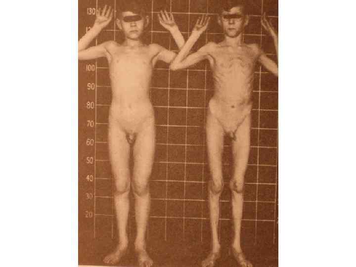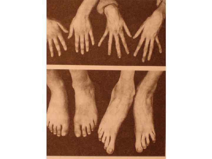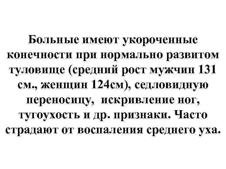 Больные имеют укороченные конечности при нормально развитом туловище (средний рост мужчин 131 см. , женщин 124 см), седловидную переносицу, искривление ног, тугоухость и др. признаки. Часто страдают от воспаления среднего уха.