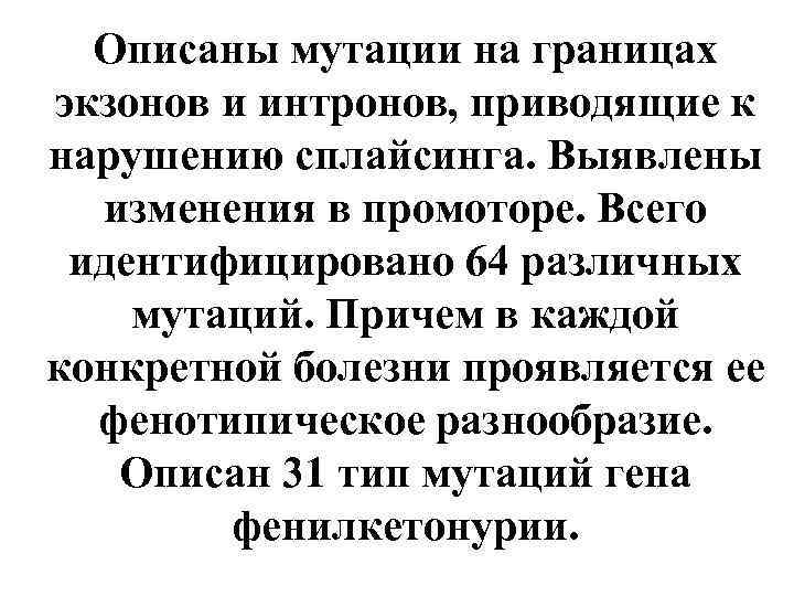 Описаны мутации на границах экзонов и интронов, приводящие к нарушению сплайсинга. Выявлены изменения в промоторе. Всего идентифицировано 64 различных мутаций. Причем в каждой конкретной болезни проявляется ее фенотипическое разнообразие. Описан 31 тип мутаций гена фенилкетонурии.