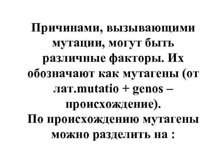 Причинами, вызывающими мутации, могут быть различные факторы. Их обозначают как мутагены (от лат. mutatio + genos – происхождение). По происхождению мутагены можно разделить на :