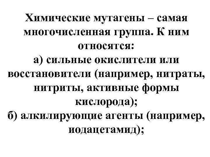 Химические мутагены – самая многочисленная группа. К ним относятся: а) сильные окислители или восстановители (например, нитраты, нитриты, активные формы кислорода); б) алкилирующие агенты (например, иодацетамид);