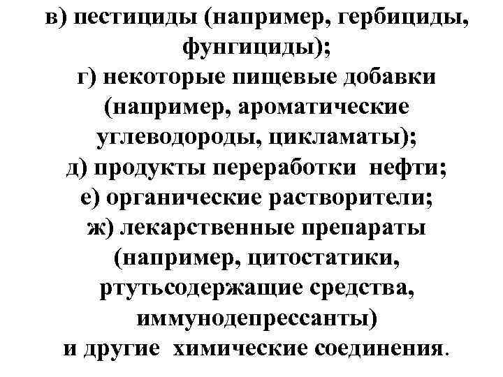 в) пестициды (например, гербициды, фунгициды); г) некоторые пищевые добавки (например, ароматические углеводороды, цикламаты); д) продукты переработки нефти; е) органические растворители; ж) лекарственные препараты (например, цитостатики, ртутьсодержащие средства, иммунодепрессанты) и другие химические соединения.