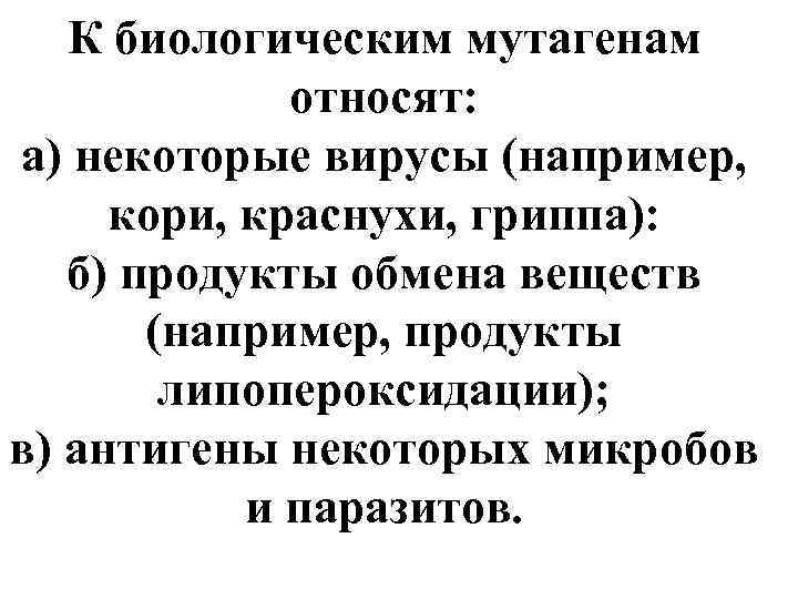 К биологическим мутагенам относят: а) некоторые вирусы (например, кори, краснухи, гриппа): б) продукты обмена веществ (например, продукты липопероксидации); в) антигены некоторых микробов и паразитов.