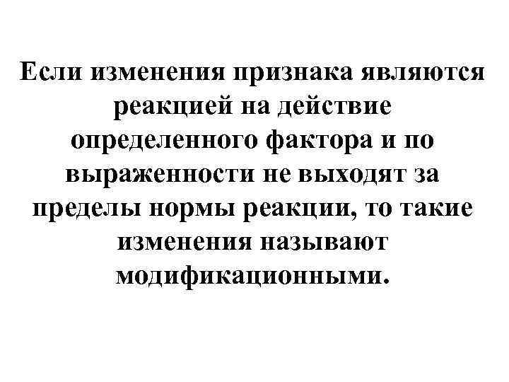 Если изменения признака являются реакцией на действие определенного фактора и по выраженности не выходят за пределы нормы реакции, то такие изменения называют модификационными.