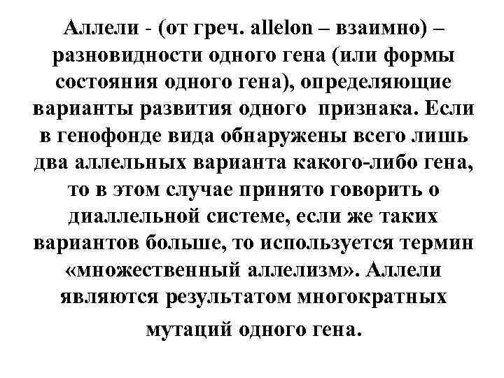 Аллели - (от греч. allelon – взаимно) – разновидности одного гена (или формы состояния одного гена), определяющие варианты развития одного признака. Если в генофонде вида обнаружены всего лишь два аллельных варианта какого-либо гена, то в этом случае принято говорить о диаллельной системе, если же таких вариантов больше, то используется термин «множественный аллелизм» . Аллели являются результатом многократных мутаций одного гена.