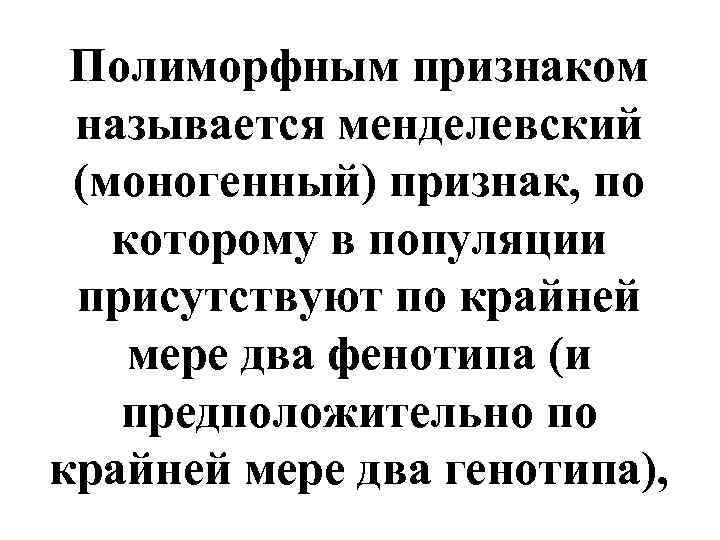 Полиморфным признаком называется менделевский (моногенный) признак, по которому в популяции присутствуют по крайней мере два фенотипа (и предположительно по крайней мере два генотипа),
