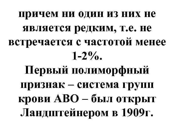 причем ни один из них не является редким, т. е. не встречается с частотой менее 1 -2%. Первый полиморфный признак – система групп крови АВО – был открыт Ландштейнером в 1909 г.
