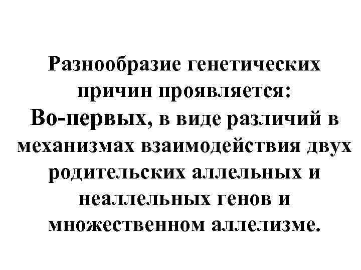 Разнообразие генетических причин проявляется: Во-первых, в виде различий в механизмах взаимодействия двух родительских аллельных и неаллельных генов и множественном аллелизме.