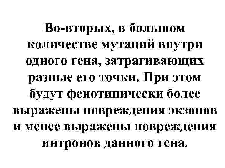 Во-вторых, в большом количестве мутаций внутри одного гена, затрагивающих разные его точки. При этом будут фенотипически более выражены повреждения экзонов и менее выражены повреждения интронов данного гена.