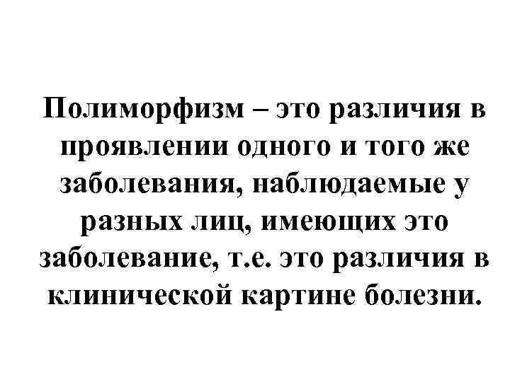 Полиморфизм – это различия в проявлении одного и того же заболевания, наблюдаемые у разных лиц, имеющих это заболевание, т. е. это различия в клинической картине болезни.