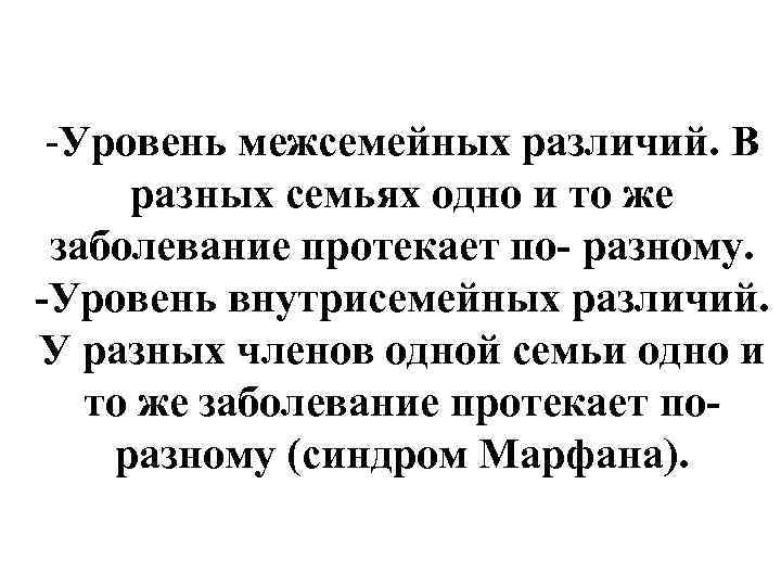 -Уровень межсемейных различий. В разных семьях одно и то же заболевание протекает по- разному. -Уровень внутрисемейных различий. У разных членов одной семьи одно и то же заболевание протекает поразному (синдром Марфана).