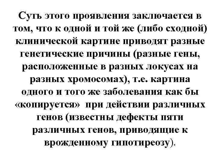 Суть этого проявления заключается в том, что к одной и той же (либо сходной) клинической картине приводят разные генетические причины (разные гены, расположенные в разных локусах на разных хромосомах), т. е. картина одного и того же заболевания как бы «копируется» при действии различных генов (известны дефекты пяти различных генов, приводящие к врожденному гипотиреозу).