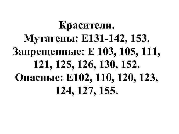 Красители. Мутагены: Е 131 -142, 153. Запрещенные: Е 103, 105, 111, 121, 125, 126, 130, 152. Опасные: Е 102, 110, 123, 124, 127, 155.