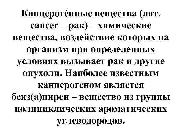 Канцерогéнные вещества (лат. cancer – рак) – химические вещества, воздействие которых на организм при определенных условиях вызывает рак и другие опухоли. Наиболее известным канцерогеном является бенз(а)пирен – вещество из группы полициклических ароматических углеводородов.