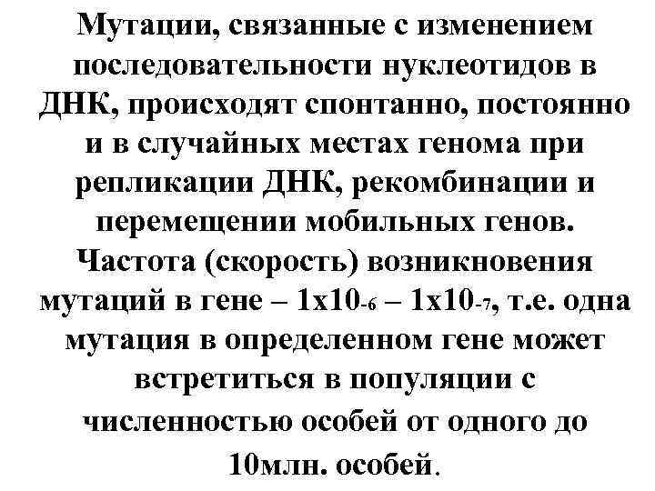 Мутации, связанные с изменением последовательности нуклеотидов в ДНК, происходят спонтанно, постоянно и в случайных местах генома при репликации ДНК, рекомбинации и перемещении мобильных генов. Частота (скорость) возникновения мутаций в гене – 1 х10 -6 – 1 х10 -7, т. е. одна мутация в определенном гене может встретиться в популяции с численностью особей от одного до 10 млн. особей.