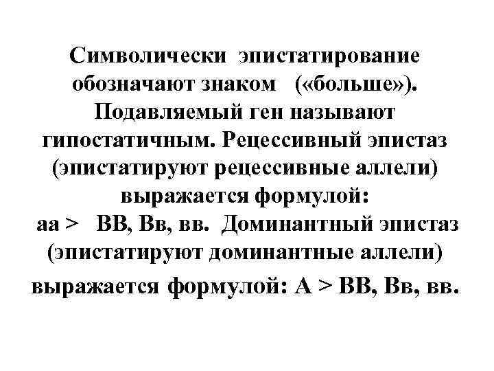 Символически эпистатирование обозначают знаком ( «больше» ). Подавляемый ген называют гипостатичным. Рецессивный эпистаз (эпистатируют рецессивные аллели) выражается формулой: аа > ВВ, Вв, вв. Доминантный эпистаз (эпистатируют доминантные аллели) выражается формулой: А > ВВ, Вв, вв.