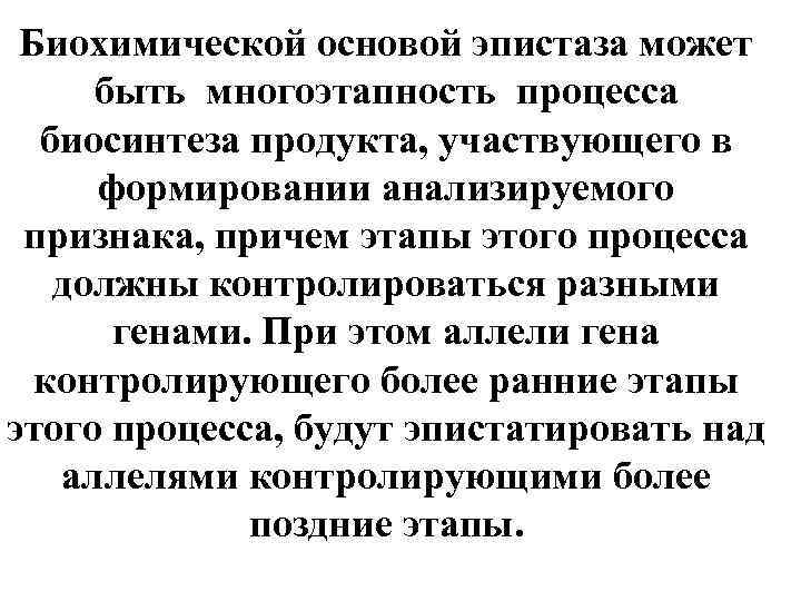 Биохимической основой эпистаза может быть многоэтапность процесса биосинтеза продукта, участвующего в формировании анализируемого признака, причем этапы этого процесса должны контролироваться разными генами. При этом аллели гена контролирующего более ранние этапы этого процесса, будут эпистатировать над аллелями контролирующими более поздние этапы.