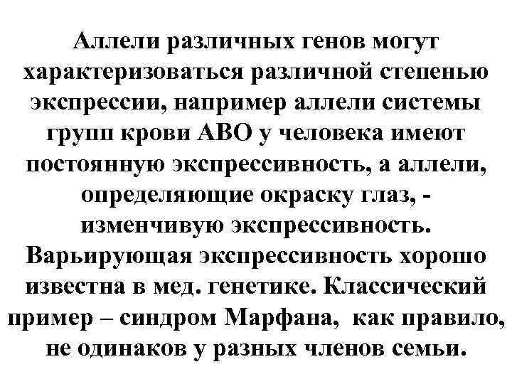 Аллели различных генов могут характеризоваться различной степенью экспрессии, например аллели системы групп крови АВО у человека имеют постоянную экспрессивность, а аллели, определяющие окраску глаз, - изменчивую экспрессивность. Варьирующая экспрессивность хорошо известна в мед. генетике. Классический пример – синдром Марфана, как правило, не одинаков у разных членов семьи.
