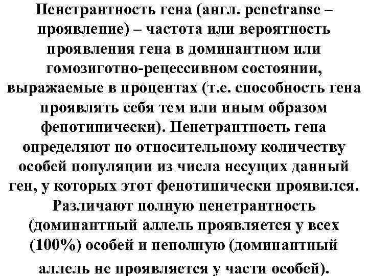 Пенетрантность гена (англ. penetranse – проявление) – частота или вероятность проявления гена в доминантном или гомозиготно-рецессивном состоянии, выражаемые в процентах (т. е. способность гена проявлять себя тем или иным образом фенотипически). Пенетрантность гена определяют по относительному количеству особей популяции из числа несущих данный ген, у которых этот фенотипически проявился. Различают полную пенетрантность (доминантный аллель проявляется у всех (100%) особей и неполную (доминантный аллель не проявляется у части особей).