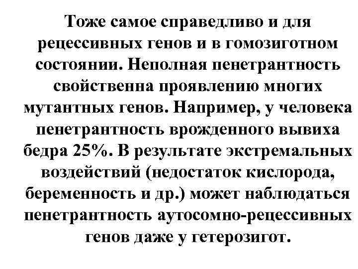 Тоже самое справедливо и для рецессивных генов и в гомозиготном состоянии. Неполная пенетрантность свойственна проявлению многих мутантных генов. Например, у человека пенетрантность врожденного вывиха бедра 25%. В результате экстремальных воздействий (недостаток кислорода, беременность и др. ) может наблюдаться пенетрантность аутосомно-рецессивных генов даже у гетерозигот.