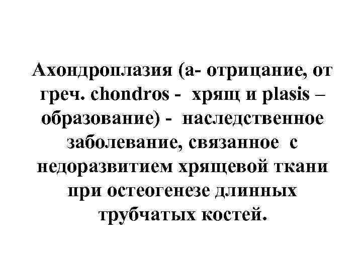 Ахондроплазия (а- отрицание, от греч. chondros - хрящ и plasis – образование) - наследственное заболевание, связанное с недоразвитием хрящевой ткани при остеогенезе длинных трубчатых костей.