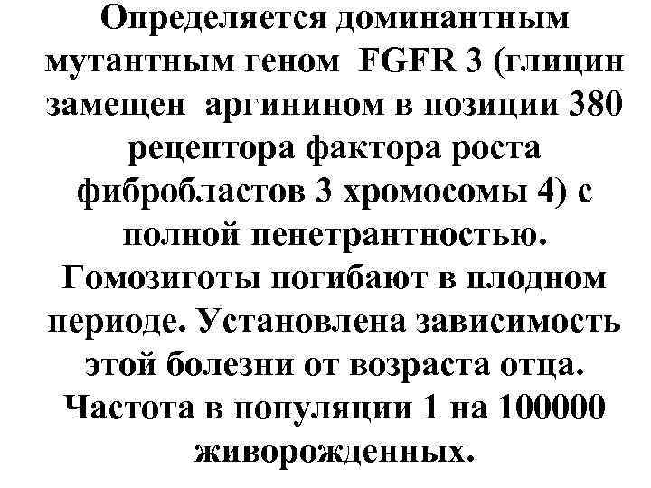 Определяется доминантным мутантным геном FGFR 3 (глицин замещен аргинином в позиции 380 рецептора фактора роста фибробластов 3 хромосомы 4) с полной пенетрантностью. Гомозиготы погибают в плодном периоде. Установлена зависимость этой болезни от возраста отца. Частота в популяции 1 на 100000 живорожденных.