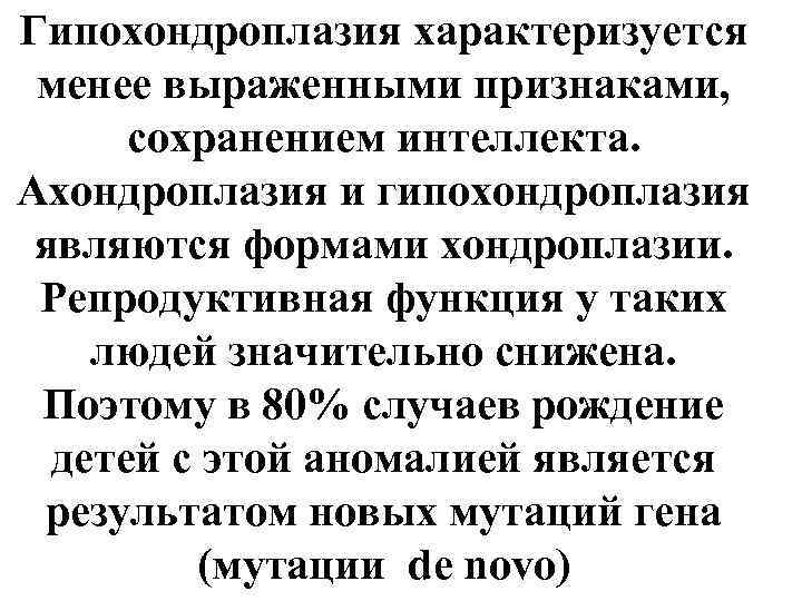 Гипохондроплазия характеризуется менее выраженными признаками, сохранением интеллекта. Ахондроплазия и гипохондроплазия являются формами хондроплазии. Репродуктивная функция у таких людей значительно снижена. Поэтому в 80% случаев рождение детей с этой аномалией является результатом новых мутаций гена (мутации de novo)