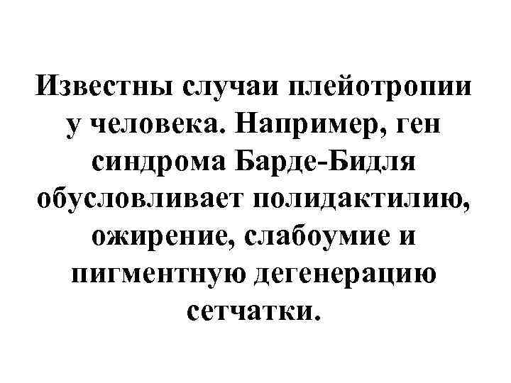 Известны случаи плейотропии у человека. Например, ген синдрома Барде-Бидля обусловливает полидактилию, ожирение, слабоумие и пигментную дегенерацию сетчатки.